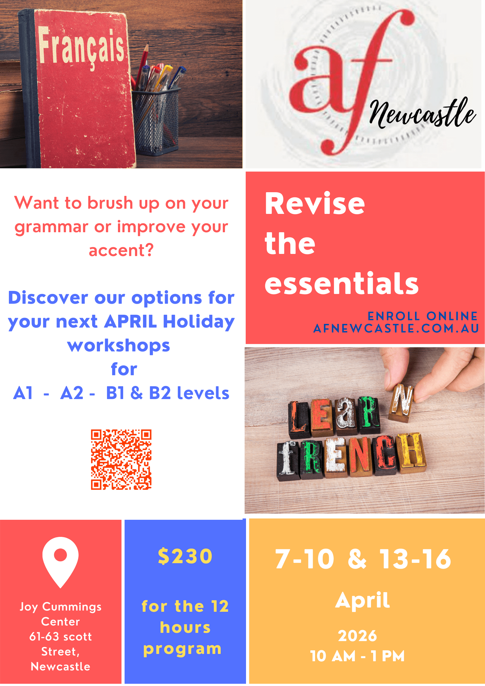 🌞🇫🇷 Boost Your French These April Holidays! Join our April Holiday Workshops — a 12-hour intensive program designed to help you revise the essentials and strengthen your French skills in a supportive and engaging environment. Whether you are studying at A1, A2, B1 or B2 level, these workshops are a great opportunity to consolidate your knowledge, revisit key grammar points, practise speaking, and build confidence before the next term. Perfect if you would like to refresh your French, fill in a few gaps, or simply enjoy learning in a relaxed holiday atmosphere. ✨ A great way to keep your French active and continue progressing with confidence!